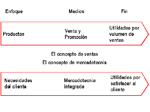 La orientación primitiva de las empresas era hacia la producción, pero pasando el tiempo las empresas empezaron a orientarse hacia la venta. Cuando hablamos de ventas lo hacemos en sentido amplio: se vende lo que el cliente necesita; por tanto, hay que ir a buscar las necesidades del cliente. El siguiente gráfico trata de aclarar la distinción entre el concepto de ventas y el de mercadotecnia o comercialización.