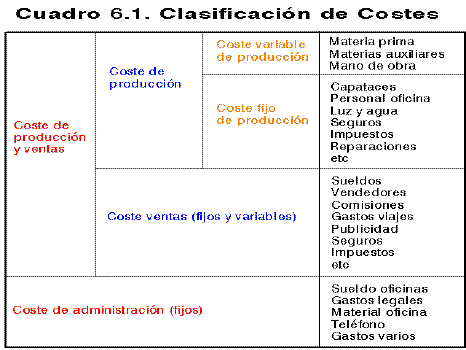 Hay multitud de clasificaciones de costes. En el cuadro siguiente vemos un