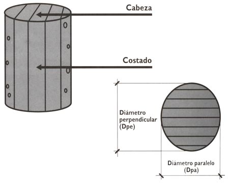 Las dimensiones de los tapones, longitud y diámetro, se expresan en milímetros y se utilizan para identificarlos de la forma siguiente: Tapón 44x24. Es un tapón de 44 mm. de longitud nominal por 24 mm. de diámetro nominal. Para los tapones cilíndricos de una pieza de corcho natural el diámetro es la media aritmética de los diámetros, medidos en sentido paralelo y perpendicular a las líneas de crecimiento (Ver figura 2.20). El término nominal se refiere a cómo se nombran o nominan, las dimensiones reales se determinan en los ensayos y se comparan con las nominales para comprobar si están dentro de las tolerancias exigidas.